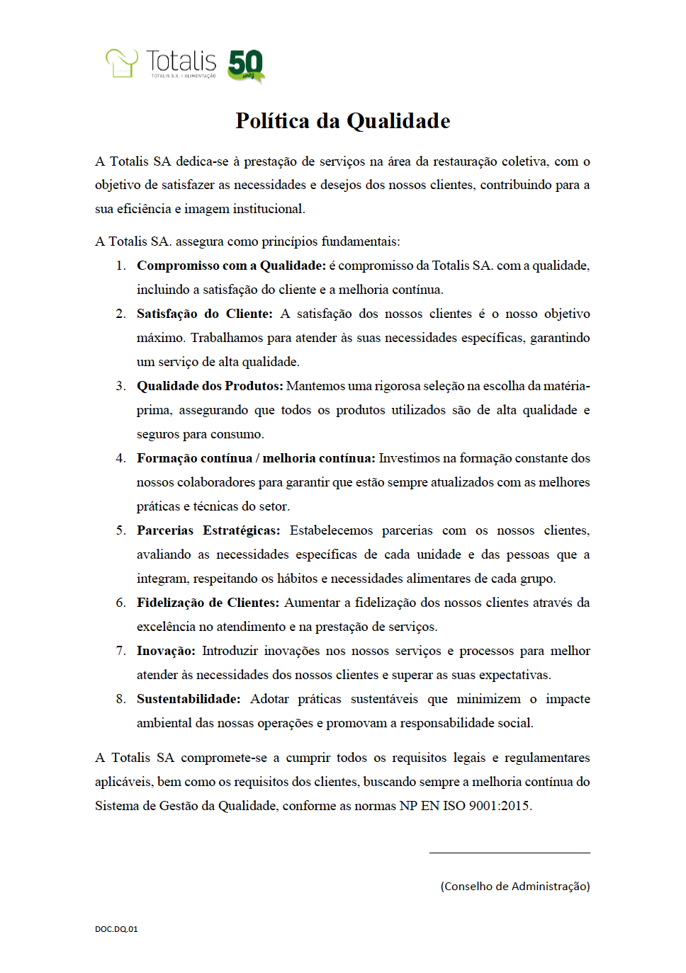 A Totalis SA compromete-se a cumprir todos os requisitos legais e regulamentares aplicáveis, bem como os requisitos dos clientes, buscando sempre a melhoria contínua do sistema de gestão da qualidade, conforme as normas NP EN ISO 9001:2015.